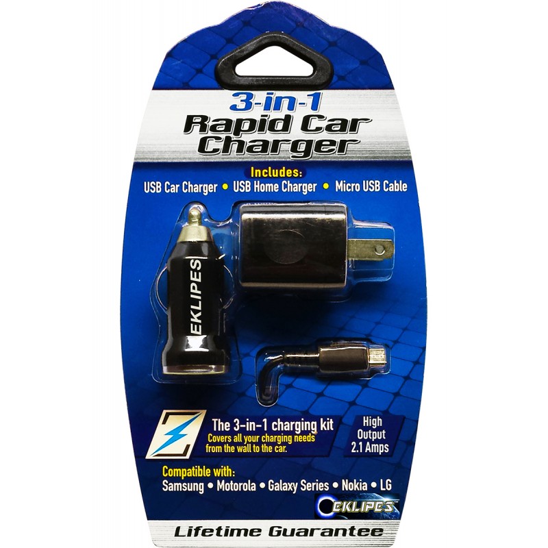 EKA-311C Micro-B / Android 3-in-1 USB Rapid Charge Kit works on all devices compatible with Micro-B USB Charging, such as: Androids, Tablets, Power Banks eReaders, Cameras, Headphones, and more!  This kit covers all your charging needs from home to the car.  Both Chargers have state-of-the-art USB Ports designed to automatically control the flow of current.  This protects against damage to the battery due to overcharging.