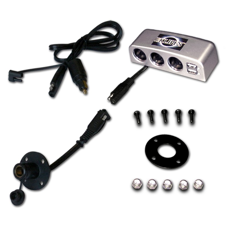 This package includes a Multi-Port Charging Station with an SAE Dual Pin Quick Connector Plug, waterproof caps, a Customized Tank Bag Flange Mount that attaches to your tank bag or saddle bag, and a 2 Ft 10 Inch Extension Cable that connects your motorcycle bag to any standard 12 Volt Battery Harness.