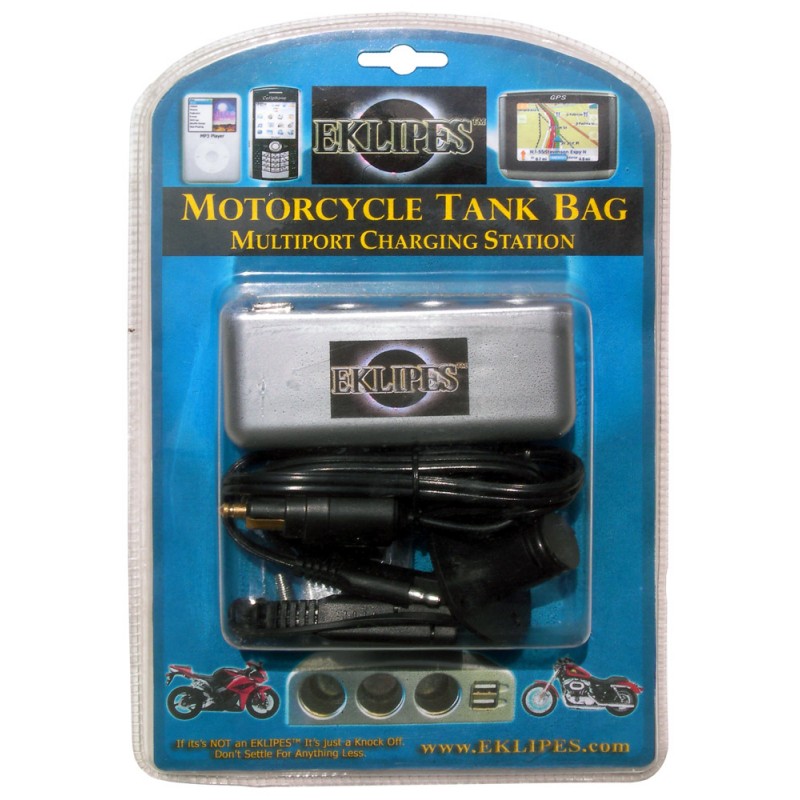 Our Patented EK1-214 EKLIPES™ Silver Motorcycle Tank / Saddle Bag Multi-Port Charging Station is the Ultimate Power Sports Charging Station with Three 12 Volt Power Sockets, 2 USB Ports, and an LED indicator light, and perfect for charging all your mobile devices and equipment within the safety of your motorcycle tank bag or saddle bag!